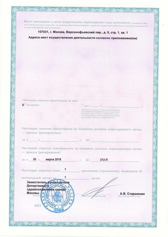 Интернатура по специальности «Стоматология общей практики»: ФГБОУ ВО РНИМУ имени Н.И.Пирогова – 2016 год. Срок действия сертификата – 5 лет.